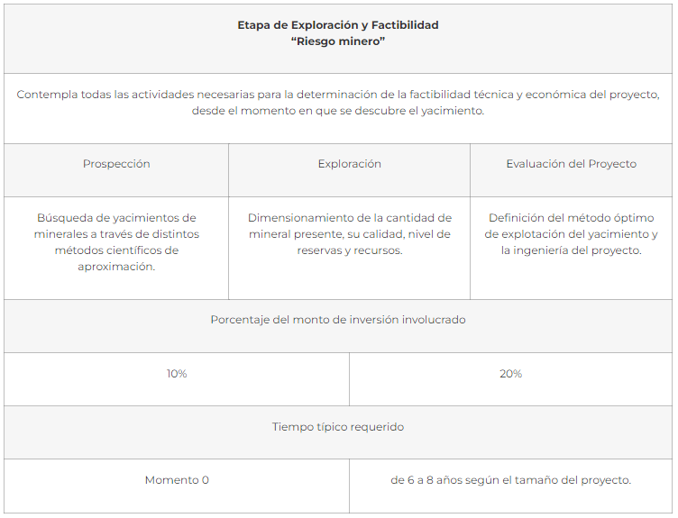 Entre 2 y 4 años según el tamaño del proyecto. | Entre 6 y 12 años según ciclos de precios de metales y eficiencia o rentabilidad del proyecto. | ||||||||||